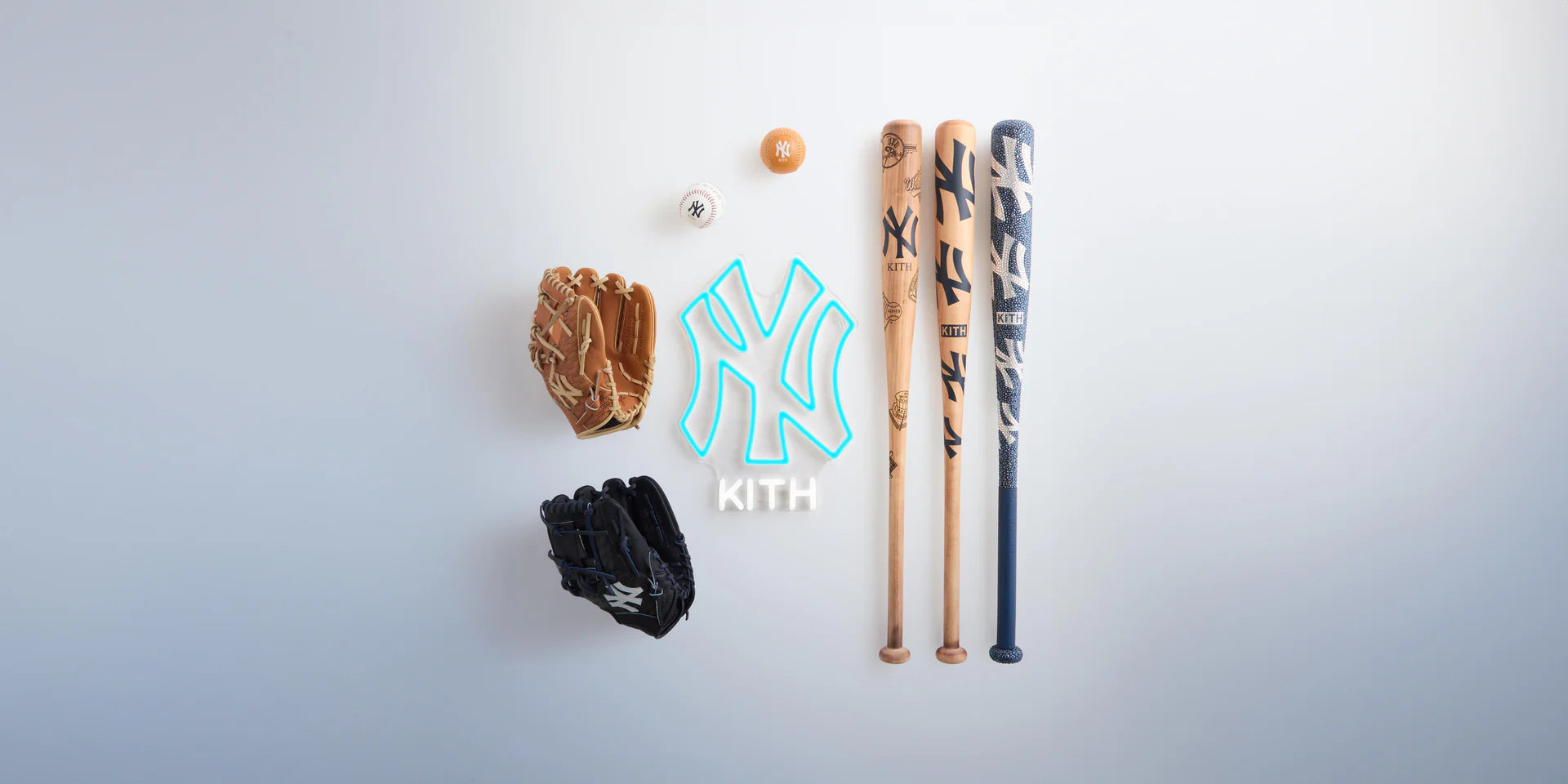 A special made-to-order collaboration with Swarovski®, Victus, and the New York Yankees, alongside all-over Kith Monogrammed Heart of the Hide Gloves made with Rawlings, collectible baseballs, wooden bats, and a custom LED sign made with Yellowpop.